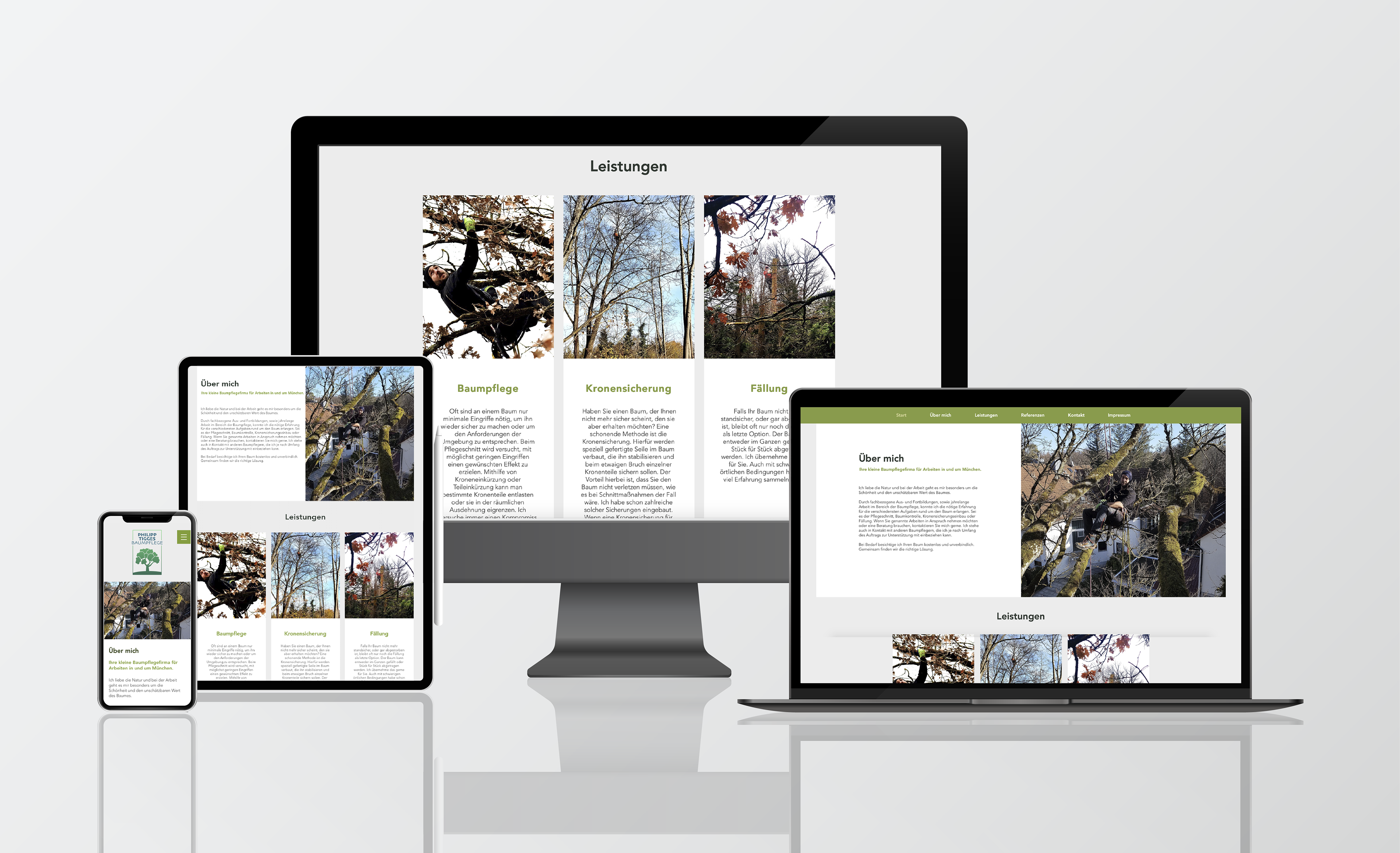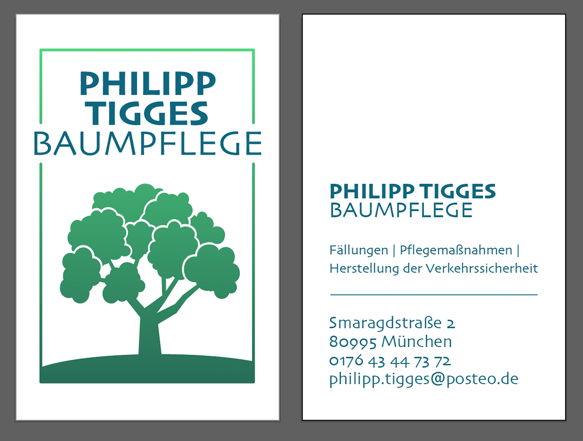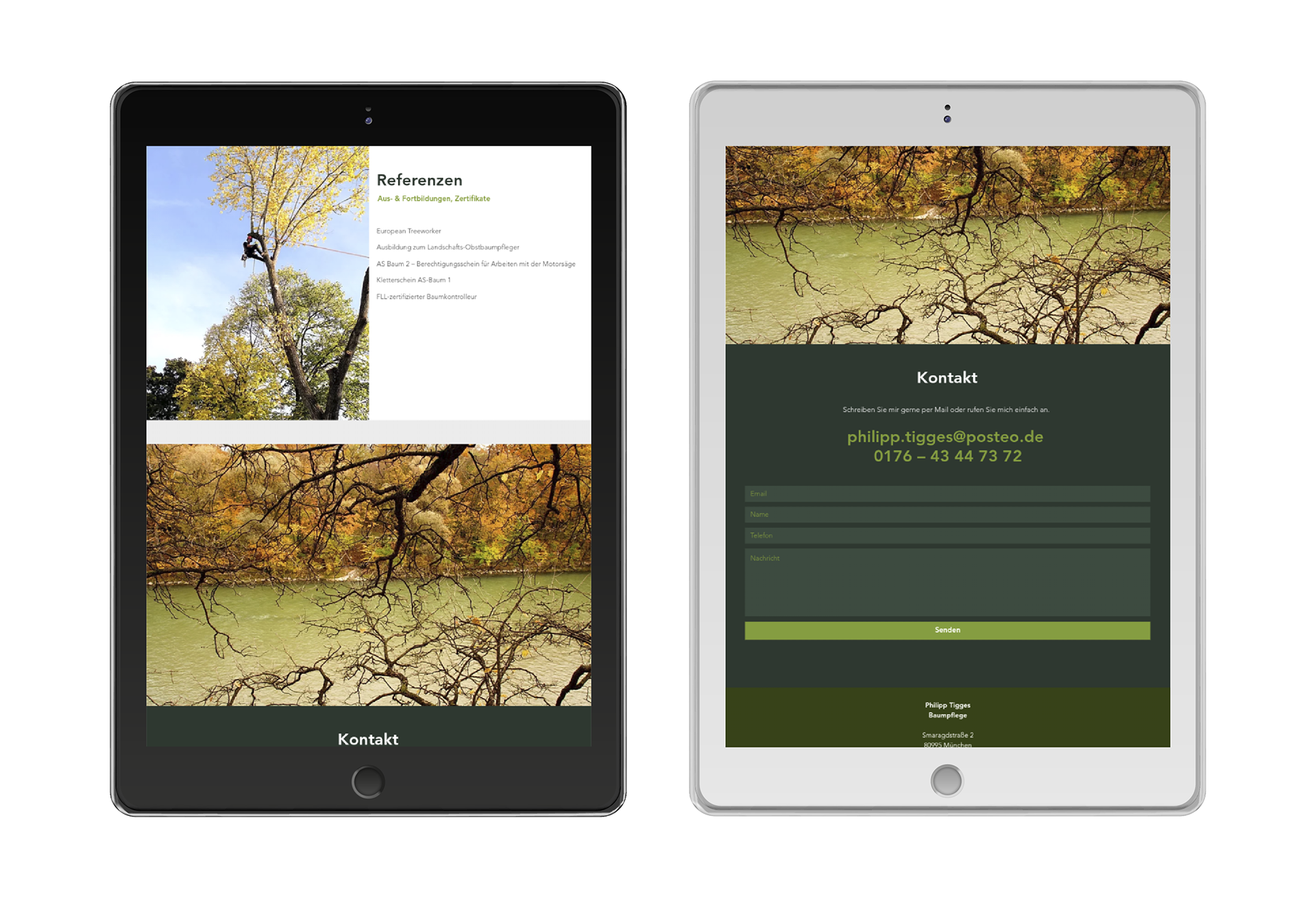 Die Baumpflegefirma Philipp Tigges kümmert sich um Arbeiten wie Pflegeschnitt, Baumkontrolle, Kronensicherungseinbau oder Fällungen in und um München. Benötigt wurde zunächst ein Logo, welches sich nach einem beispielhaften Input über verschiedene Versionen zur Formfindung bis hin zum detaillierten finalen Entwurf entwickelt hat. Anschließend wurden passende repräsentative Visitenkarten, sowie eine Unternehmenswebsite erstellt, die als Onepager kurz und prägnant die wichtigsten Leistungen beschreiben und die Leidenschaft für naturbezogene Arbeiten darstellen sollte. Die Website wurde auch für Mobile optimiert. ––––– Treeworker Philipp Tigges' company offers solutions for tree care, inspection, safety and cutting in and around the Munich area. First they needed a logo which was created after collecting examples and developing many different versions in order to find the right shape and colours. This was followed by creating business cards and a onepager website, that should be able to present the company's services and passion for nature related works. The website was also optimized for mobile.