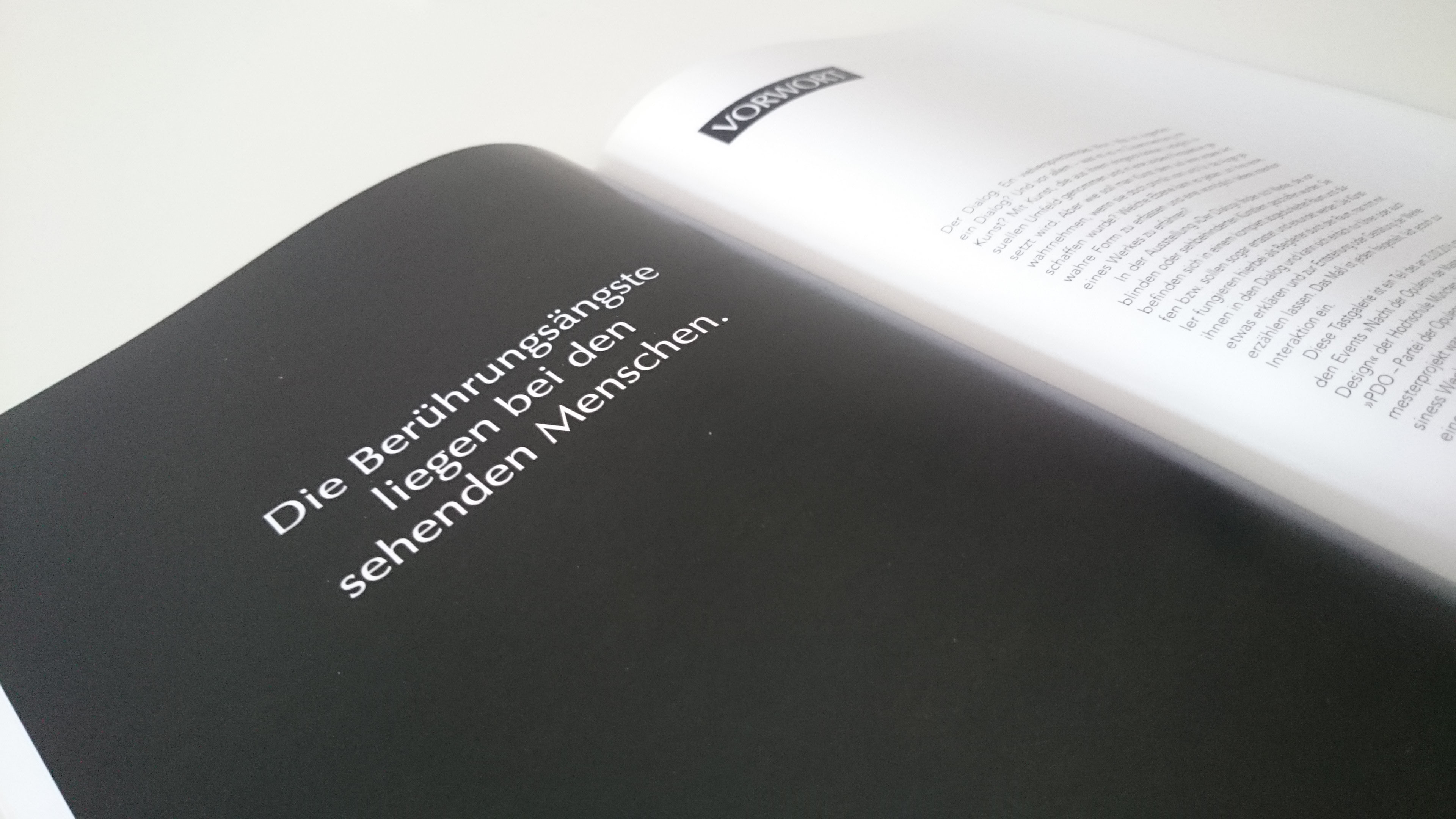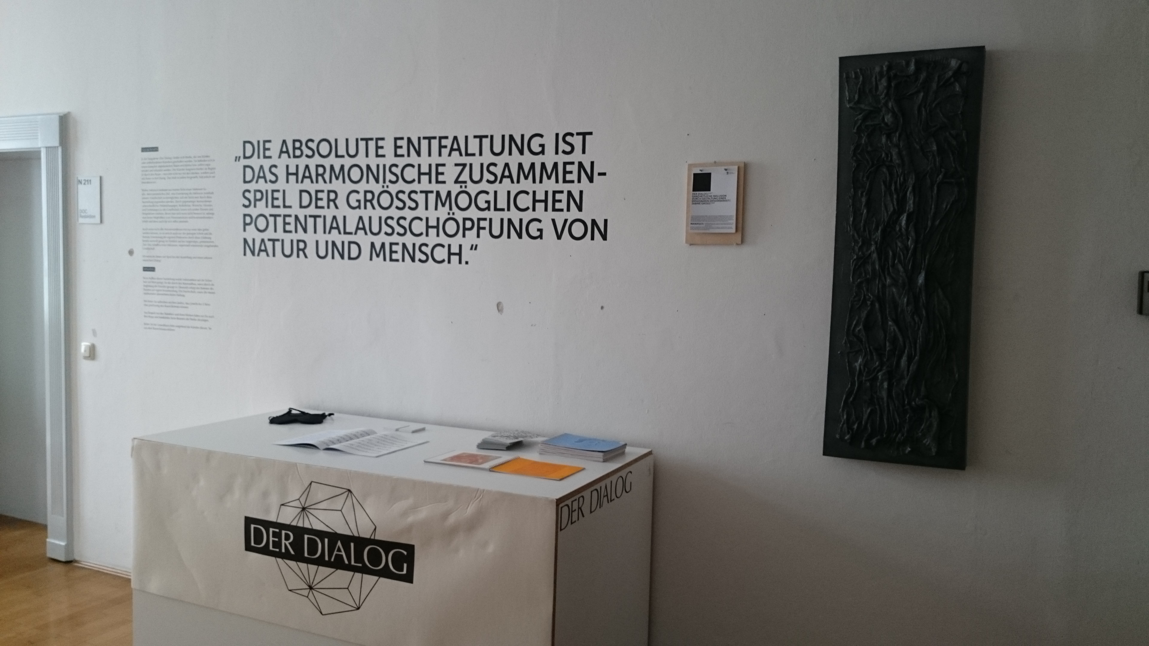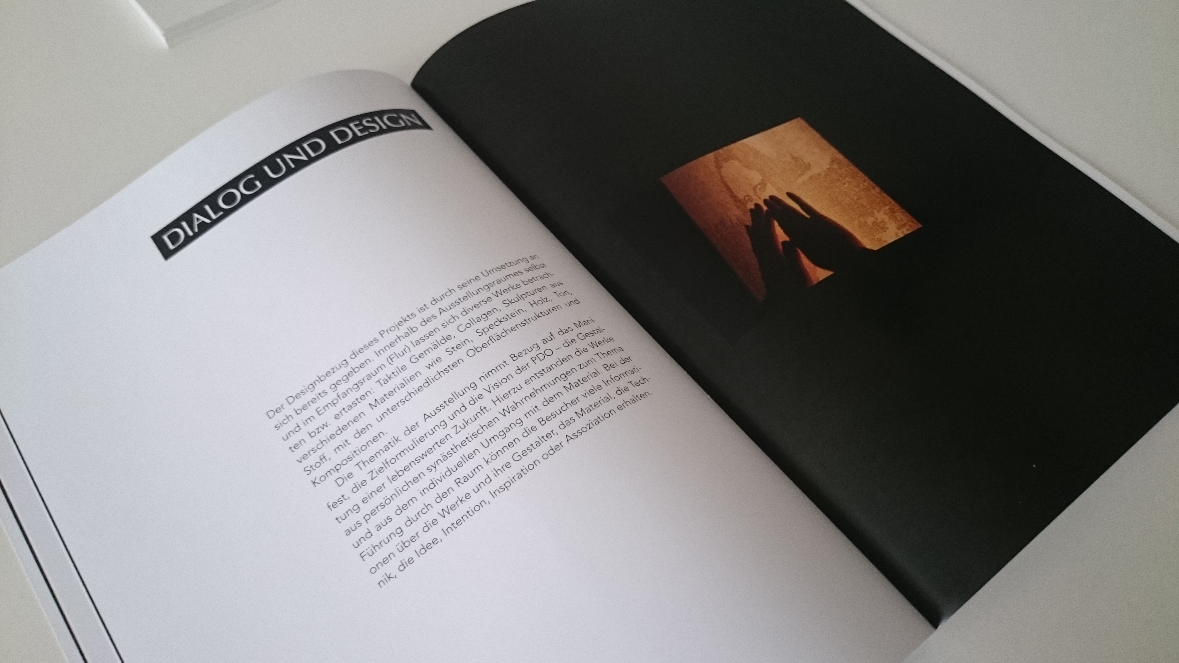 Der Dialog – Ganzheitliche Inklusion durch Gestaltung einer »erfassbaren« Erfahrbarkeit Die Berührungsängste liegen bei den sehenden Menschen. Der Dialog. Ein vielversprechendes Wort. Was ist eigentlich ein Dialog? Und vor allem – was ist es im Zusammenhang mit Kunst? Mit Kunst, die aus ihrem eingeschränkten, lediglich visuellen Umfeld genommen und in eine andere Perspektive gesetzt wird. Aber wie soll man Kunst denn auf eine andere Art wahrnehmen, wenn sie doch primär vom und für das Auge geschaffen wurde? Welche Ebene kann es geben, um ihre reine, wahre Form zu erfassen und eine womöglich tiefere Intention eines Werkes zu erfahren? In der Ausstellung »Der Dialog« finden sich Werke, die von blinden oder sehbehinderten Künstlern geschaffen wurden. Sie befinden sich in einem komplett abgedunkelten Raum und dürfen bzw. sollen sogar ertastet und erkundet werden. Die Künstler fungieren hierbei als Begleiter durch den Raum, man tritt mit ihnen in den Dialog und kann sich einfach nur führen oder auch etwas erklären und zur Entstehung oder Gestaltung der Werke erzählen lassen. Das Maß ist jedem freigestellt, lädt jedoch zur Interaktion ein. Diese Tastgalerie war ein Teil des am 25.02.2016 veranstalteten Events »Nacht der Opulenz« der Masterklasse »Advanced Design« der Hochschule München. ––––– The Dialogue – Inclusion through the creation of a touchable experience The sighted people have more fear of contact than the blind. The dialogue. A promising word. But what is a dialogue? Especially, when it's linked to art? To art, which is taken out of its limited, only visual environment and set into another perspective. But how can you sense art in another way, when it is primarily been created for the eye? Which perspective is the one to experience its pure, true form and therefore deeper intention of a work? At the exhibition »The Dialogue« you can find works, created by blind or visually impaired artists. In a completely dark room, the works may and should be touched and explored. The artists guide the people through the exhibition in the dark, and you experience a dialogue both with the works and the artists. They also explain their inspiration and process of creation, if you like to know. It's an invitation to interaction. This touch gallery was a part of the event »Night of Opulence« on February 25, 2016, organized by the Master class in »Advanced Design« of Munich University of Applied Sciences.