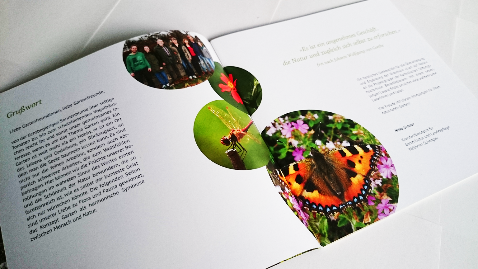 Die 48-seitige Broschüre »Lust auf Natur in unseren Gärten« wurde vom Kreisverband für Gartenkultur und Landespflege im Rahmen der Landkreisaktion »Biene, Hummel & Co« im Landkreis Weilheim-Schongau in Auftrag gegeben. Nach der Sammlung der Inhalte, Zitate, Bilder und Texte, sowie deren Aufbereitung für den Druck, folgte die Konzeption und Erstellung eines ansprechenden Layouts, sowie Satz und Reinzeichnung für die finale Druckversion. Mit 2 Auflagen von je 20.000 Stück wurde die Broschüre im Rahmen einer offiziellen Auftaktveranstaltung präsentiert und verteilt. ––––– The 48-page brochure »Lust auf Natur in unseren Gärten« was created for the non-profit district association of gardening culture and landscape planning when starting the campaign »Biene, Hummel & Co« in the district Weilheim-Schongau. After collecting the content, quotes, images and copy, as well as preparing those for print, the layout concept and creation followed. After prepress and printing of two versions with 20000 copies each, the brochure was presented and distributed in the campaign's official opening event.